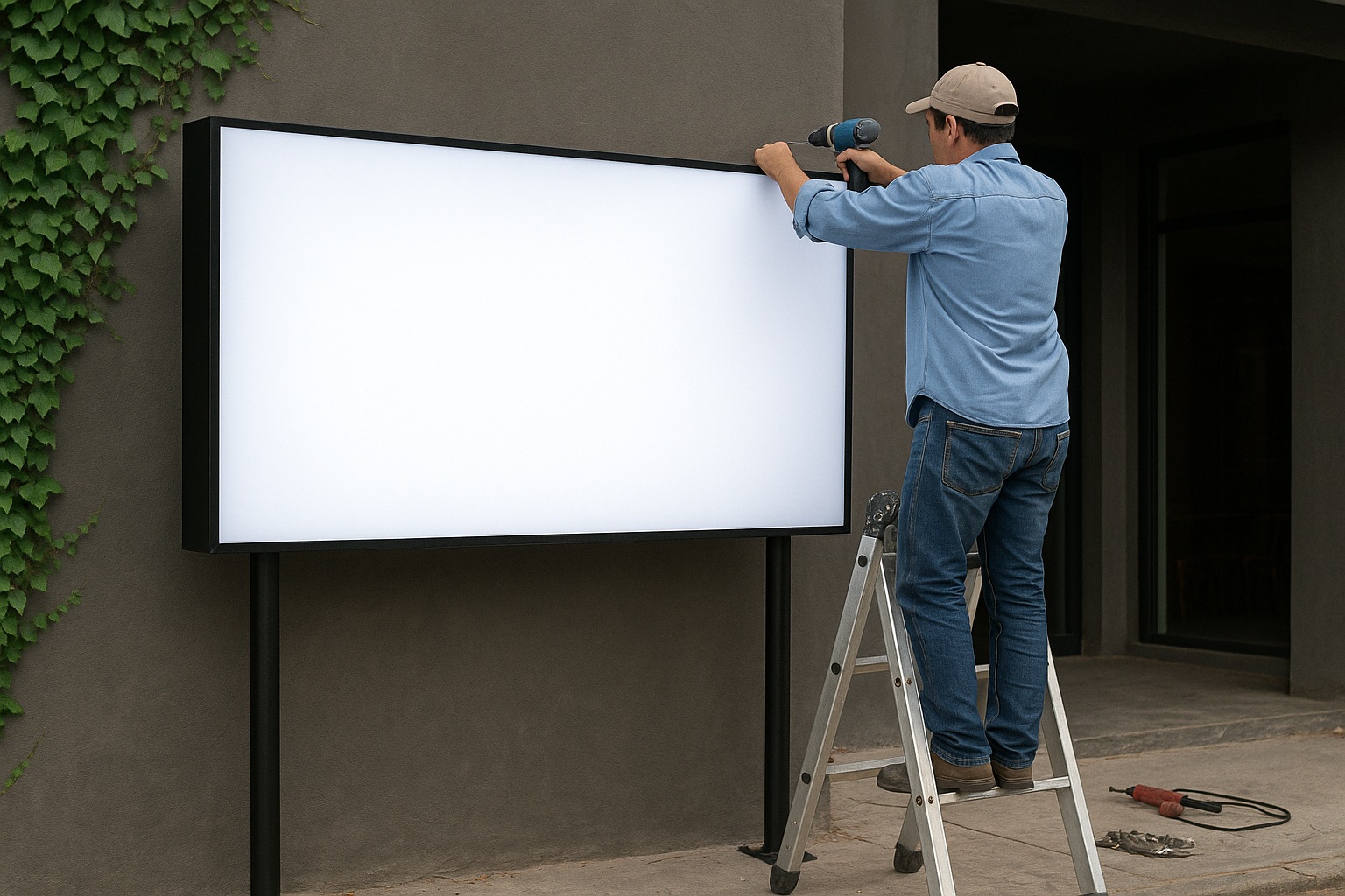 Thi công lắp đặt: Treo bảng hiệu đúng kỹ thuật, cố định chắc chắn.