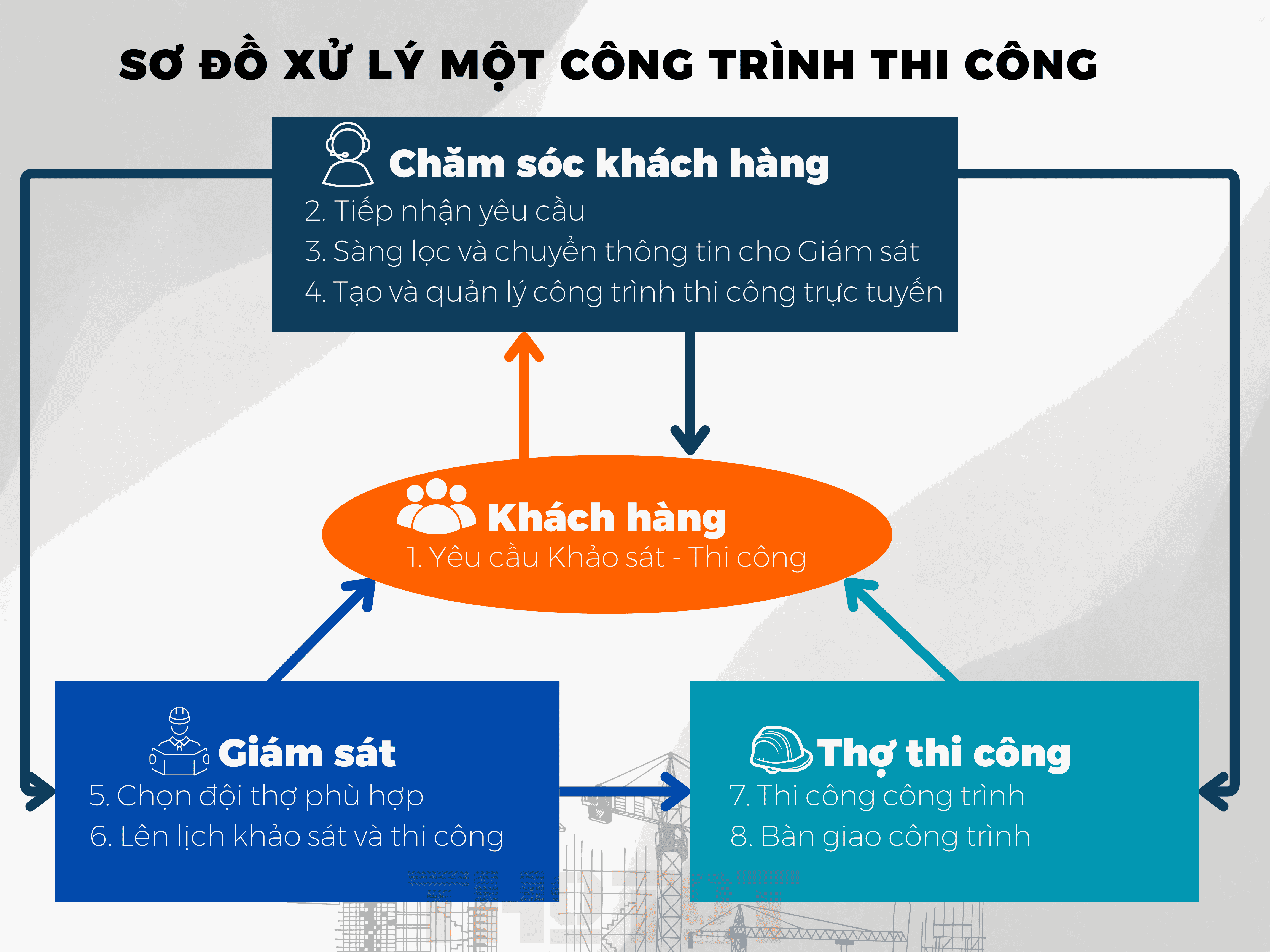 Đội ngũ Thợ Tốt sẽ có 3 phòng ban chính tham gia vào quá trình xử lý và hoàn thành một công trình thi công, nhằm đảm bảo chất lượng dịch vụ cao nhất cho khách hàng